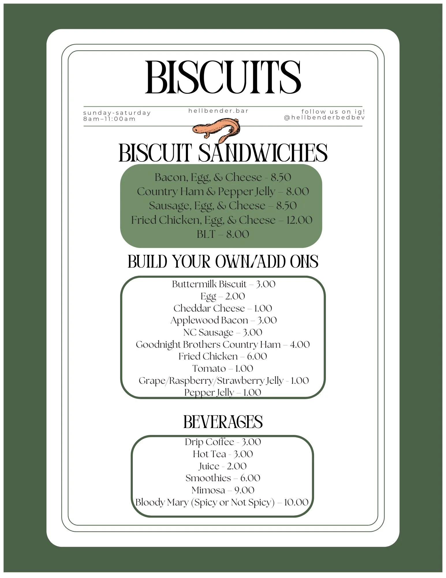 BREAKFAST Biscuit Menu (served Every Day 8am-11am) Download Biscuit Menu PDF Full Breakfast Menu (served Tuesday-Saturday 8am-11am) Download Breakfast Menu PDF Brunch Menu (served Sundays 10am-3pm) Download Brunch Menu PDF
